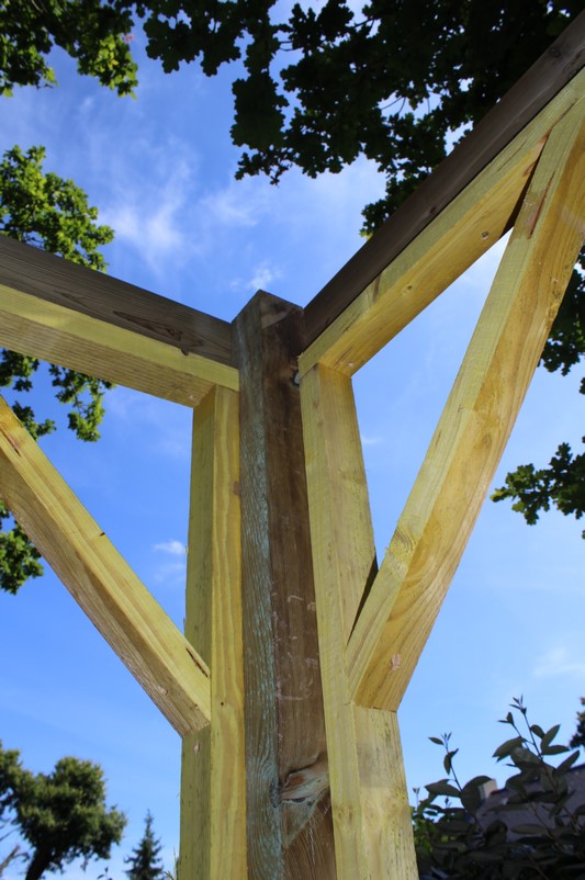 Poteau 14*14 sur platines galva fixées sur massif béton / ossature bois / toiture bac acier bleu ardoise + 1 polycarbonate transparente pour plus de luminosité, bardage posé par le client.